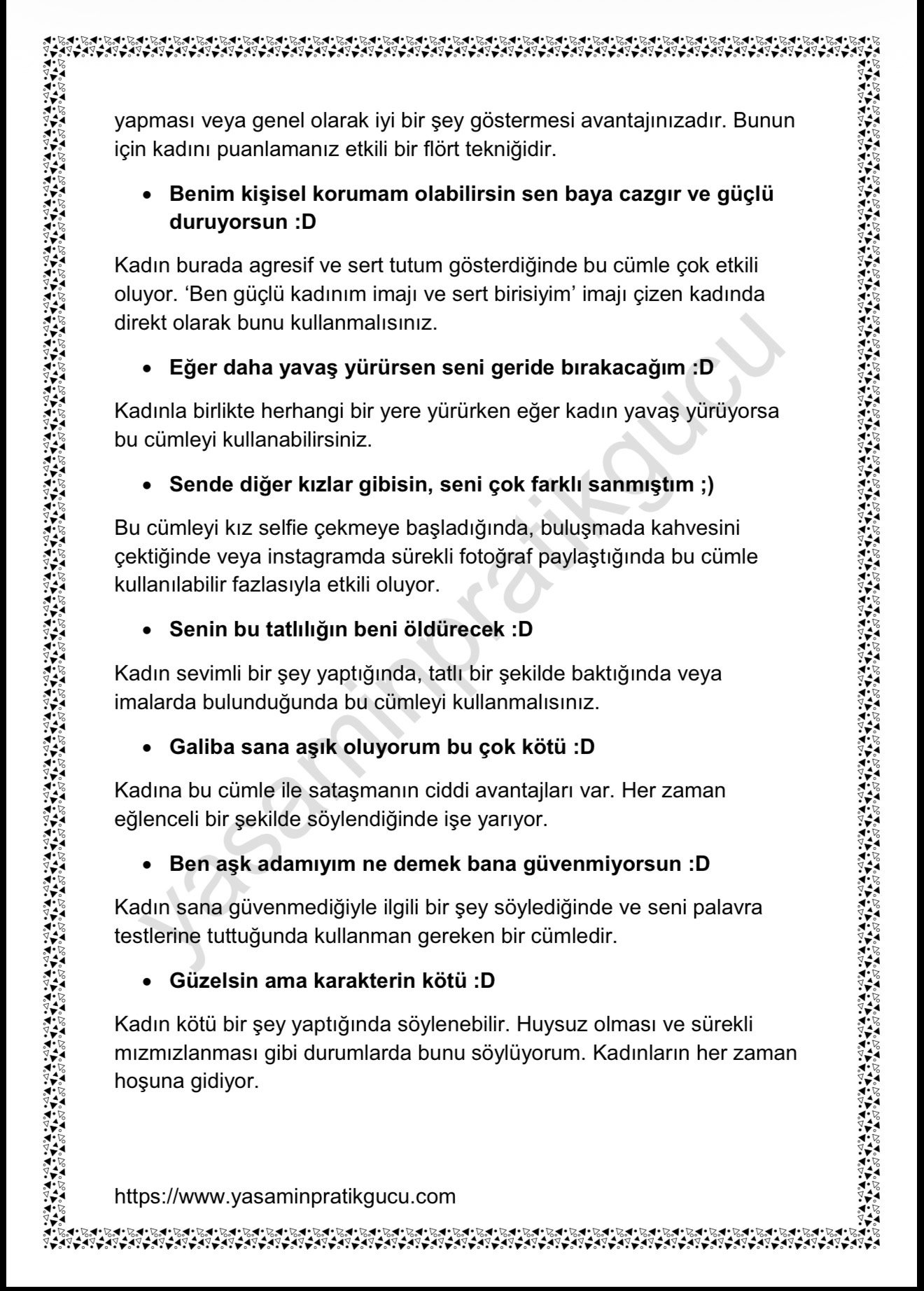 flört etmeyi hiç beceremeyen bende bile işe yarıyor gerçekten cümlelerin pratik şekilde sıralanması hoşuma gitti istediğini seç beğen kullan malzeme çok